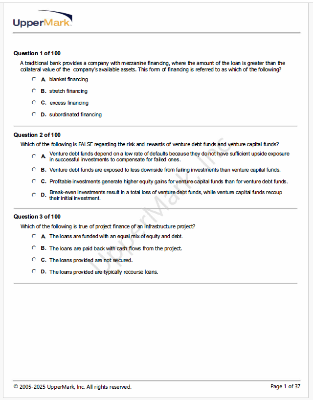 CAIA 2025 UpperMark mock exam, CAIA Level 1 practice test, CAIA exam prep questions, alternative investments mock exam, CAIA study guide, UpperMark CAIA test, CAIA certification practice exam.